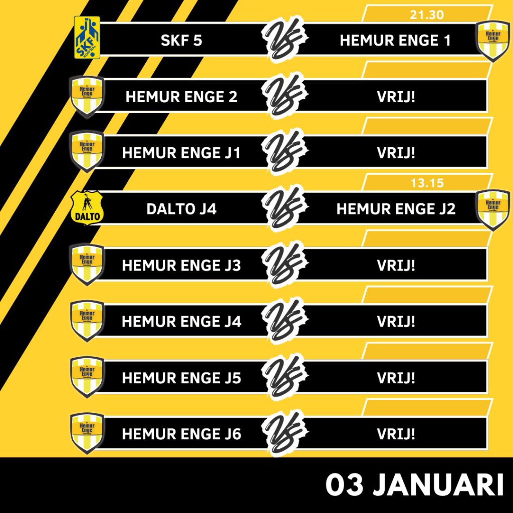 De aftrap is om 13.15 uur, wanneer de J2 het opneemt tegen de J4 van Dalto. In november ging Hemur Enge J2 nog nipt onderuit tegen de buren uit Driebergen, maar die wedstrijd liet zien dat de ploegen dicht bij elkaar liggen. Er liggen dus zeker kansen voor onze jeugd om het nieuwe jaar goed te beginnen.